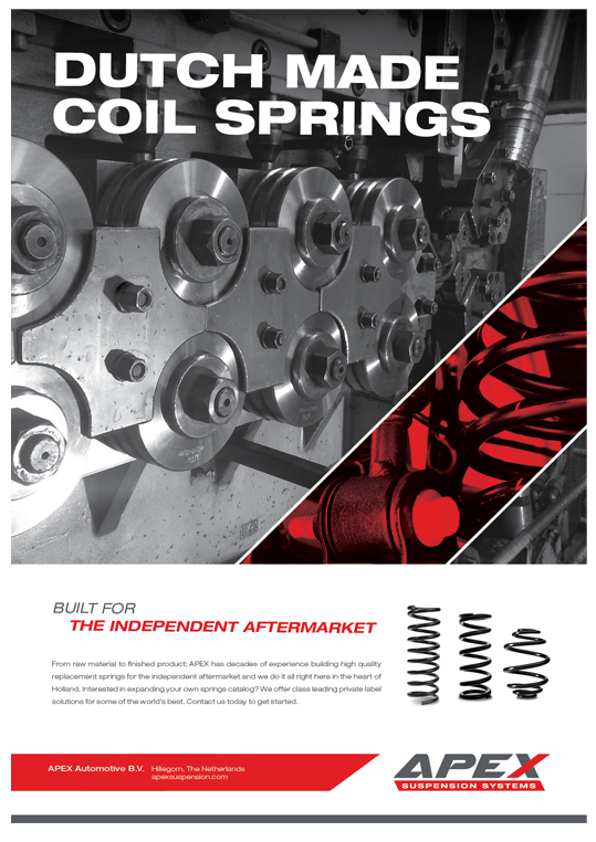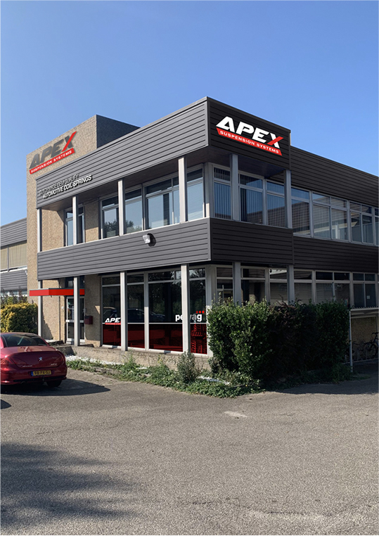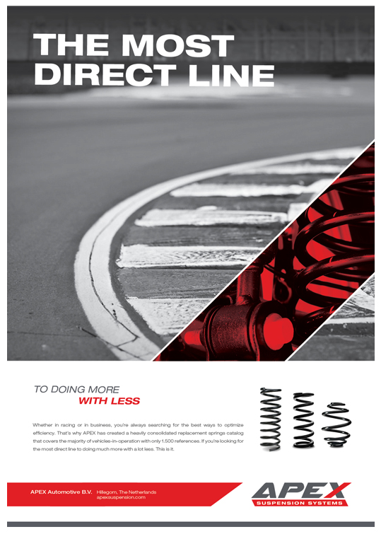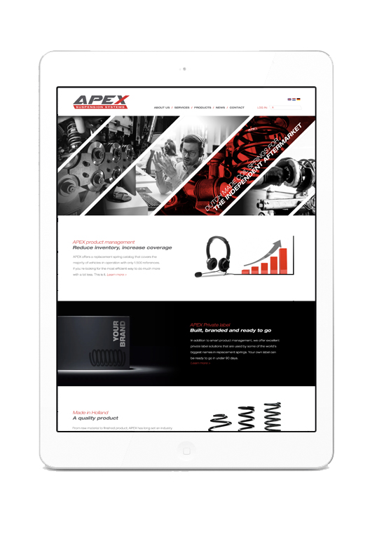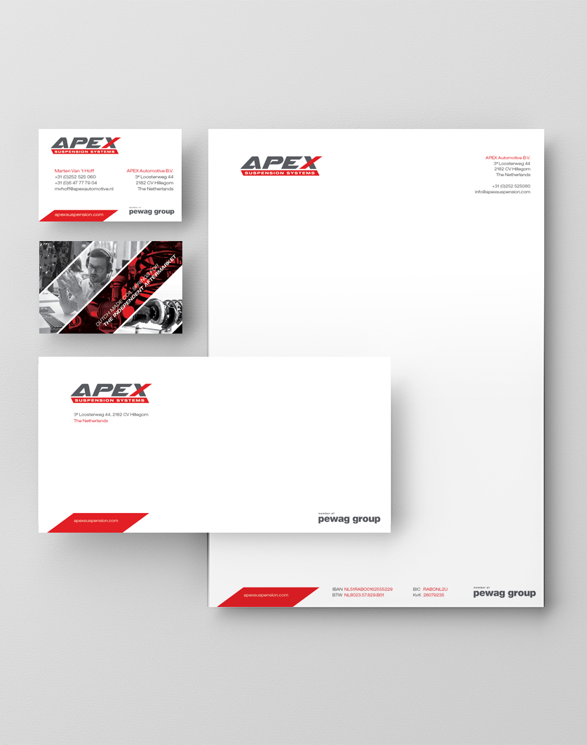 APEX International levert wereldwijd Automotive vervangingsveren en veersystemen. Al meer dan vier decennia lang. Vanuit Hillegom. Na een grondige renovatie van de fabriek en het kantoorpand, werden wij uitgenodigd om het merk van een passende uitstraling te voorzien. Primair verkoopt APEX haar producten onder private labels. Het uitgangspunt vanuit de directie is om “King of Private Label” te worden. De Apex-predator. Het passende merkconcept vonden we in de herkomst van het merk. De performance tak. Racing. Daar is het begonnen voor APEX en dit gaf ons inspiratie voor het logo en de uitstraling. Krachtig en onderscheidend in deze specifieke markt.